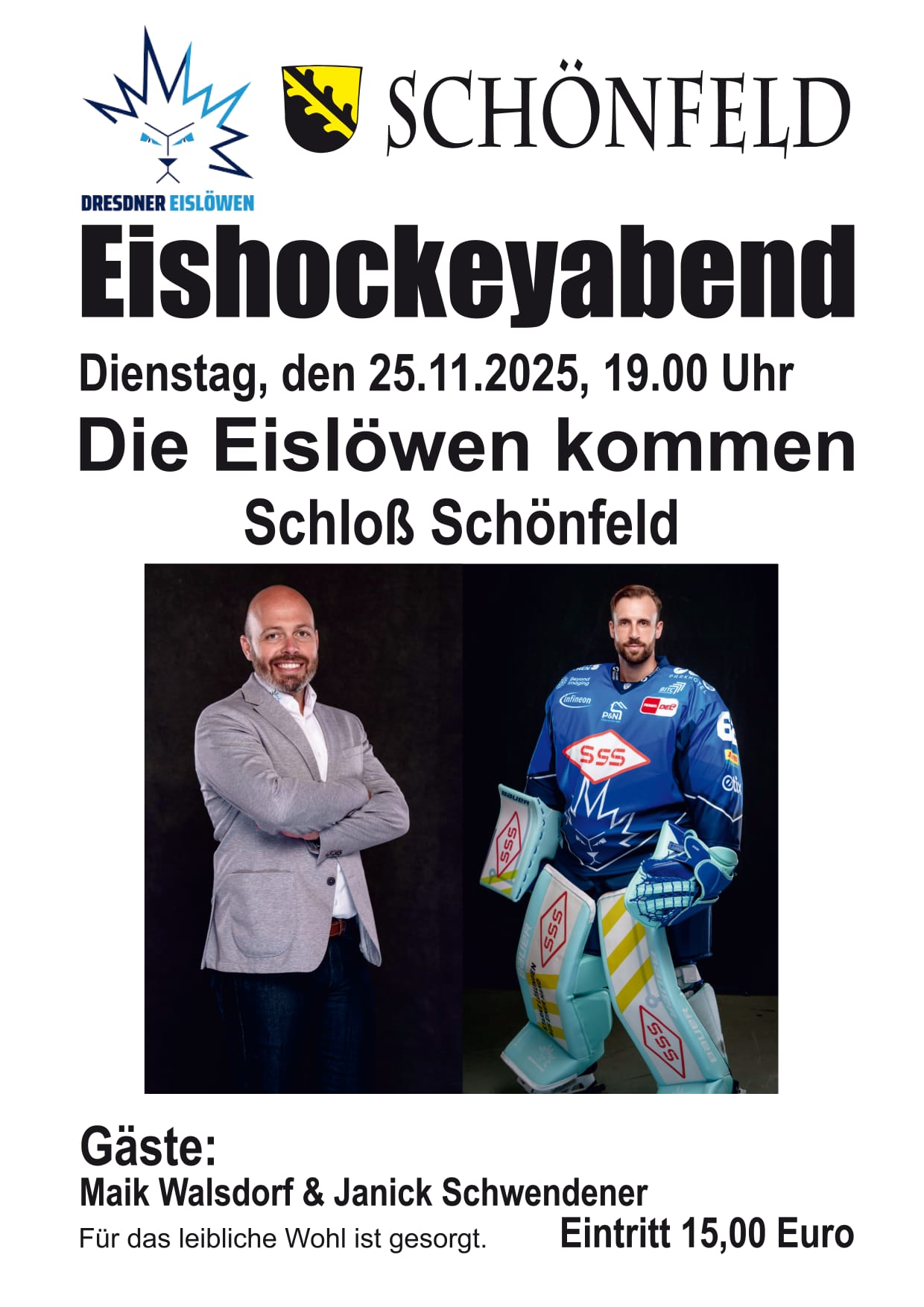 25.11.2025 - 19.00 Uhr Eishockeyabend mit den Eislöwen Maik Walsdorf und Janick Schwendener im Schloß Schönfeld